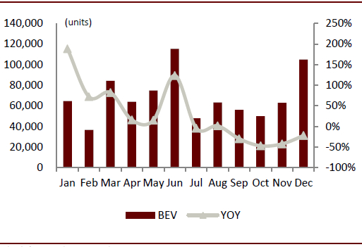图表: 2019年纯电动乘用车月度销量与增速