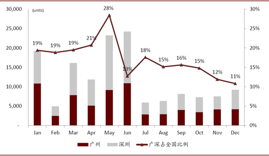 图表: 广深两地新能源销量自6月牌照放开,销量占比有明显的下降