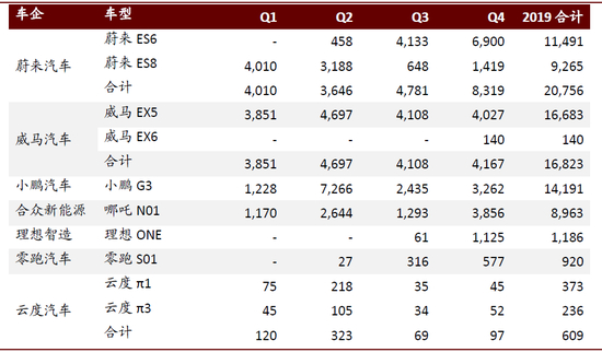 造车新势力方面,蔚来、威马、小鹏分列2019上险量前三,且数量过万,形成第一梯队。理想智造则于年底开始正式交付,我们建议关注后续爬坡情况。零跑、云度年上险量均未过千,形势不容乐观。