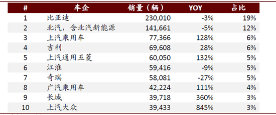 分车型看,纯电动乘用车比亚迪、北汽新能源、上汽通用五菱和江淮销量居前,市占率分别为18% /12% /7% /7%;插电混动乘用车中,比亚迪、上汽大众和华晨宝马销量居前,市占率分别为32% /14% /14%;新能源客车中,宇通以25%市占率在纯电客车中遥遥领先。