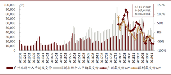 图表: 广深两地传统车车牌竞拍价格有了明显下滑