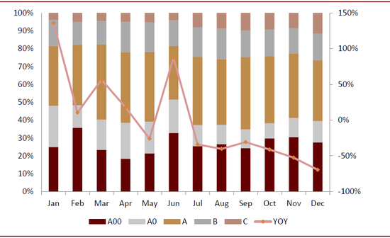 需求结构上,同样受补贴政策影响,A00级销量大幅下滑,并成为全年主要拖累。由于2019年政策对低续航里程车型严厉,对250km以下续航车型补贴完全退出,A00级电动车较同级别燃油车和低速电动车的竞争力继续下降,销量大幅下滑。全年销量-44%,上、下半年分别为-34%和-52%,呈加速下滑态势,占比也由2018年的36%大幅降至19%。而其余A0-C级车全年销量均录得两位数增长。可以看到A00级是全年新能源汽车销量的主要拖累因素。根据2019月度销量情况,A00级销量占比在低位波动,后续趋势需继续观察低续航车型的补贴退坡情况。