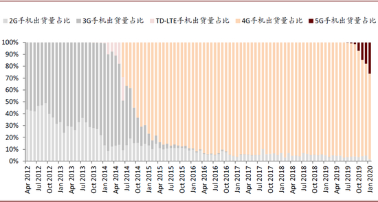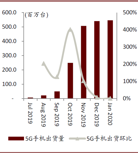 图表: 2020年1月中国5G手机出货量环比提升0.9%至546.5万部