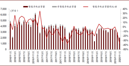 根据信通院数据,受疫情防控及春节影响,2020年1月国内智能手机出货量同比下降36.6%,但出货量中5G手机占比环比提升8.5ppt至26.3%。随着复工复产加快,疫情对中国2020年中国手机需求影响逐渐明朗。我们预计中国手机市场出货量1Q20大幅下降35%,而后将在5G换机的带动下逐季向好。