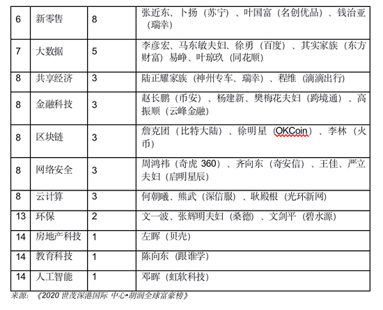 科技是主要财富来源,其次是房地产、制造业、投资和零售业。前五大行业上榜人数占整张榜单的一半