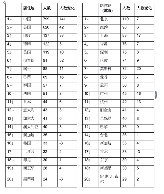 前两大居住地是中国和美国,分别有799位和626位十亿美金企业家,占全球总数的一半以上。印度上升至第三位,其次是德国和英国,这三个国家都有100多位十亿美金企业家。俄罗斯升至第六位。