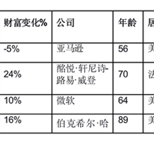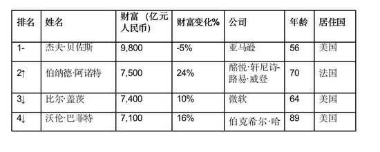 亚马逊56岁的杰夫·贝佐斯以9,800亿人民币的财富蝉联世界首富。他的财富比去年下降5%,主要是因为他与前妻麦肯齐达成了“史上最贵”离婚协议。麦肯齐以3,080亿人民币的财富独自上榜。亚马逊是市值达到1万亿美元的四家公司之一,其他三家分别是微软、苹果和谷歌。贝佐斯以1.65亿美元的价格买下媒体大亨大卫·格芬位于贝弗利山庄的豪宅,创下洛杉矶地区最贵房屋的成交记录。今年2月,贝佐斯承诺提供100亿美元帮助应对气候变化。