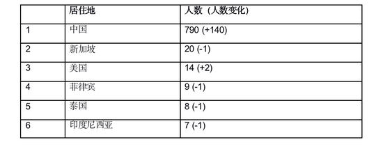 790位华人企业家居住在中国(比去年增加140位),其中669位居住在中国大陆(比去年增加129位),70位居住在香港(比去年增加7位),51位居住在台湾(比去年增加4位)。一共有799位十亿美金企业家居住在中国,其中9位不是华人。