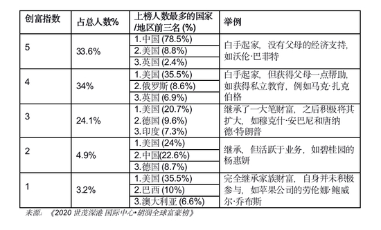 胡润研究院采取计分的形式来划分企业家们财富继承或是白手起家的等级。从1级到5级,1级表示完全继承家族财富,自身并未积极参与,5级表示在没有父母帮助的情况下白手起家。