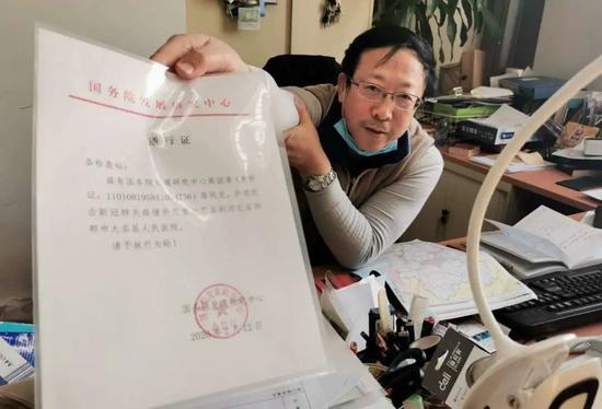 我把昨天开的通行证递了过去,警察认真的看了看,通行证上写的是国务院发展研究中心向大名人民医院运送抗击新冠肺炎的医护用品,盖的是办公厅的大章。(编者注:中国发展研究基金会为国务院发展研究中心下属单位)
