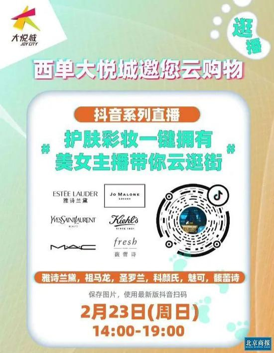 线下的冷清造就了线上的火热,各大商场纷纷联手品牌专柜做直播“带货”。北京商报记者看到,西单大悦城在每周一、三、五举行直播。截至目前,已经有雅诗兰黛专场、欧舒丹专场、情人节合辑、MOUSSY SLY合辑、丝芙兰专场等多场直播。其中在雅诗兰黛专场中,记者“蹲点”看到,直播中,导购主要向观众介绍产品用法以及现场答疑,购买产品还需要通过扫码进入微信群。