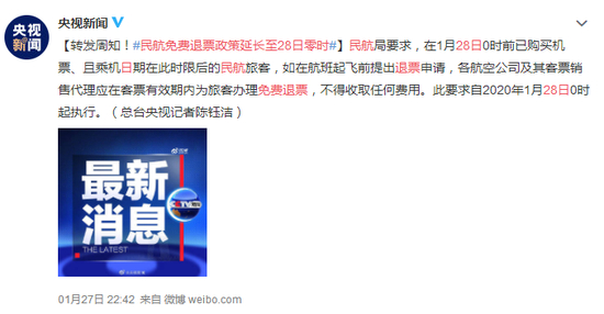 为防止疫情蔓延,民航局做出要求,自2020年1月24日0时起,此前已购买民航机票的旅客自愿退票的,各航空公司及其客票销售代理机构应免费办理退票,不得收取任何费用,后又延长至1月28日零时。