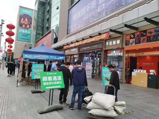记者亲身体验发现,与平时自由出入卖场不同,现在想进入卖场,消费者除了需要佩戴符合规定的防护口罩外,进入卖场前需要先扫码确定自己近期的行程轨迹。在确定记者近14天行程轨迹显示全部在深圳辖区范围内后,入口工作人员随后又给记者测量了体温并进行了现场登记后,记者最终被放行进入室内电子卖场。
