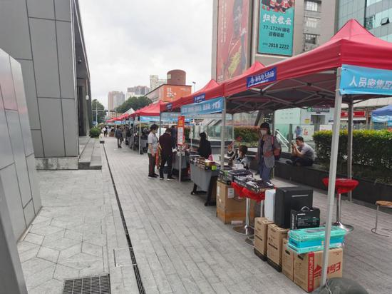 (3月8日,华强北步行街上部分商户在户外摆摊销售 记者 齐金钊 摄)