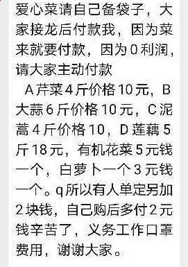 对于团购菜的菜价问题,程先生称他组织团购的菜价都比较低,“很便宜,很多不到1块钱一斤。”因在疫情期间,他询问过居民群是否同意每个订单增加两元的消毒费用,也得到居民同意。