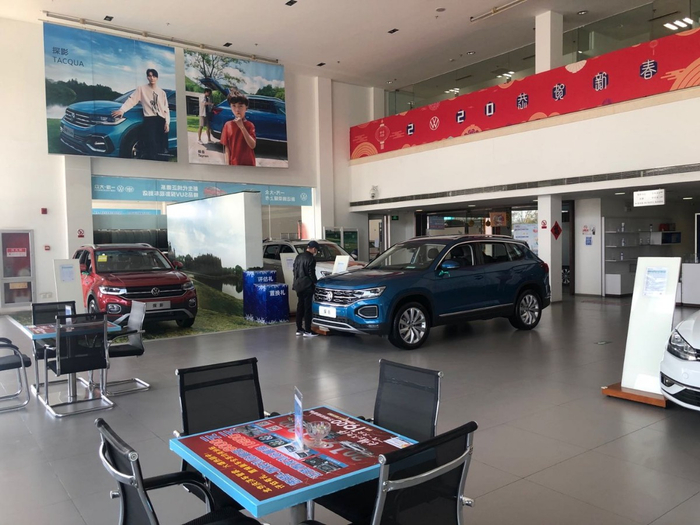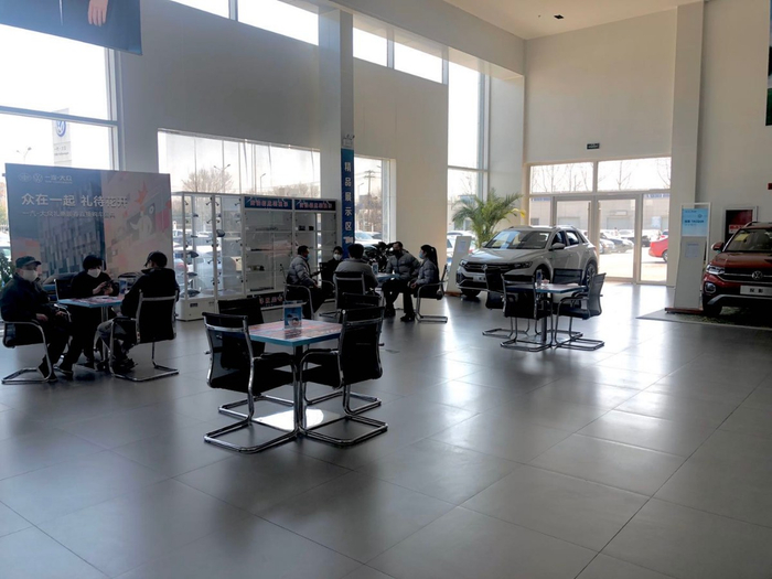 不远处的一家一汽大众4S店的人气儿倒高出不少,不到1分钟的功夫就有3辆车进入场地,销售大厅里的3张小圆桌旁都各自围坐着三四名顾客。“您别看有这么些人,但大多是老客户来做保养或者续保,真正看车的只有两组顾客,其中一组还是客户介绍过来的。”店里销售人员说。
