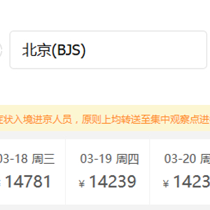 新京报记者自携程平台查询了解到,目前巴黎至北京的机票已经万元起步,且均无直飞。3月19日,这一行程最低价格为14219元,且仅剩2张。低于万元的机票要到3月23日,最低价格为7137元,但需要转机三次,飞行时间52小时45分钟。