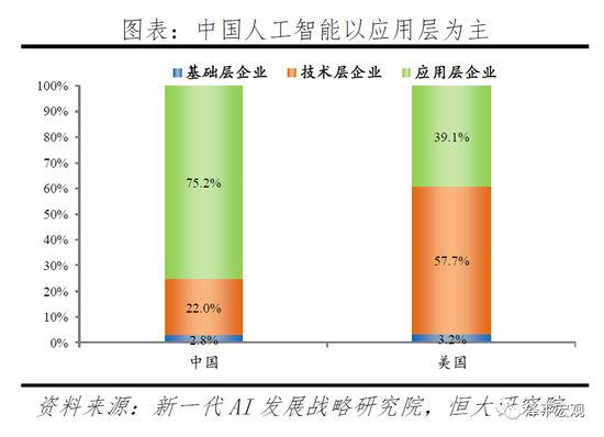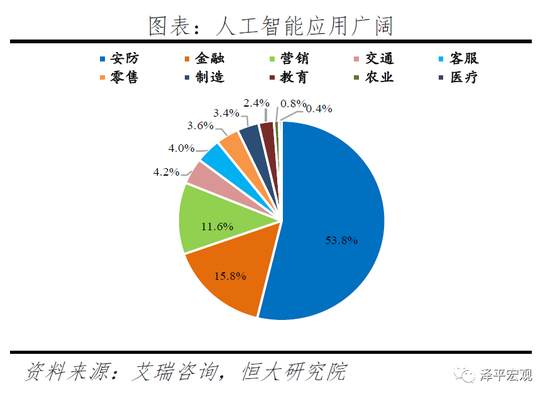 人工智能企业可分为基础层、技术层和应用层,目前中国以应用层发展为主,相关企业数量占比近八成。其中,基础层以AI芯片、计算机语言、算法架构等研发为主;技术层以计算机视觉、智能语音、自然语言理解等应用算法的研发为主,应用层解决实际问题,是人工智能技术针对行业提供产品、服务和解决方案,其核心是商业化。根据《中国新一代人工智能科技产业发展报告(2019)》,截至2019年2月,应用层人工智能企业占比最高,为75.2%;技术层居第二位,占比为22.0%;基础层企业占比最少仅为2.8%,而美国三类企业分别为39.1%、57.7%、3.2%。根据艾瑞咨询在《中国人工智能产业研究报告》中的测算,AI在安防和金融领域市场份额最大,在工业、医疗、教育等领域最具爆发力。