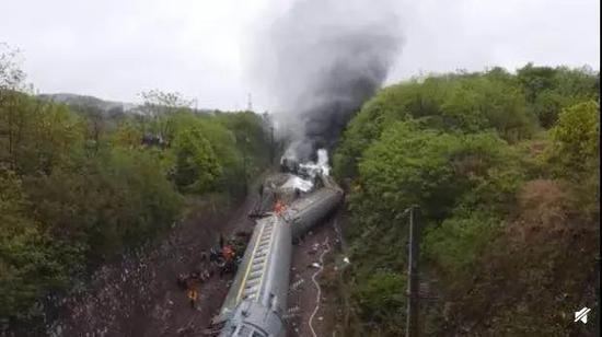 列车撞上塌方体后起火脱轨