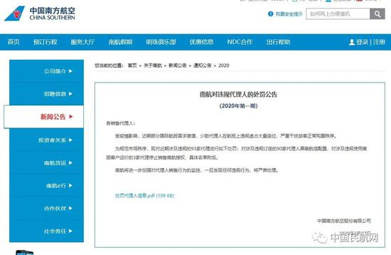 南航3月27日发布《南航对违规代理人的处罚公告》。公告对近期涉及违规的93家代理进行处罚:对涉及违规订座的90家代理人屏蔽航信配置,对涉及违规使用集团客户运价的3家代理停止销售南航授权。同时南航将进一步加强对代理人销售行为的监控,一旦发现任何违规行为,将严肃处理。