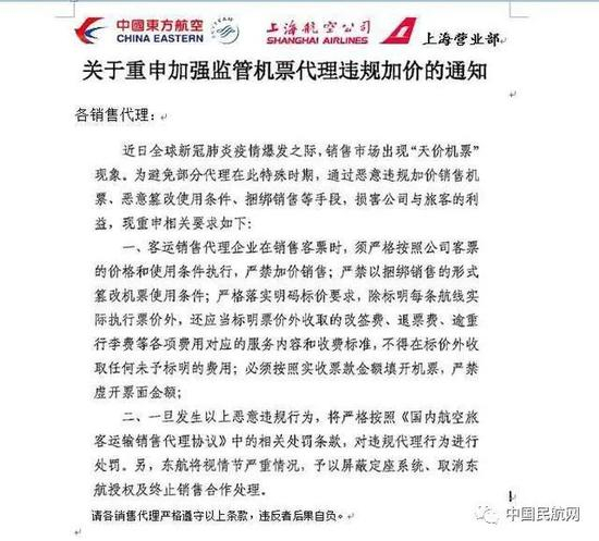 东航3月20日发布《关于重申加强监管机票代理违规加价的通知》。通知显示,东航严禁代理在销售客票时加价销售,以及以捆绑销售的形式篡改机票使用条件。