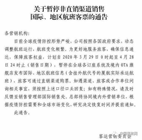 国航下发通知,为更好地服务旅客,确保信息通达、保障旅客权益,自3月29日至4月28日,暂停在全球各订座系统及境内OTA旗舰店发布国际、地区航班信息(含挂外航代号的国际实际承运航班),旅客可通过直销渠道购票。