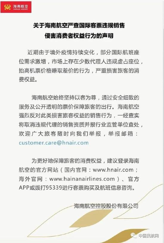 海航3月30日发布《关于海南航空严查国际客票违规销售侵害消费者权益行为的声明》。海南航空强烈反对此类损害旅客权益的销售行为,一经查实将取消违规代理的销售资质并报行业监管单位查处,欢迎广大旅客随时举报,举报邮箱:customer.care@hnair.com。