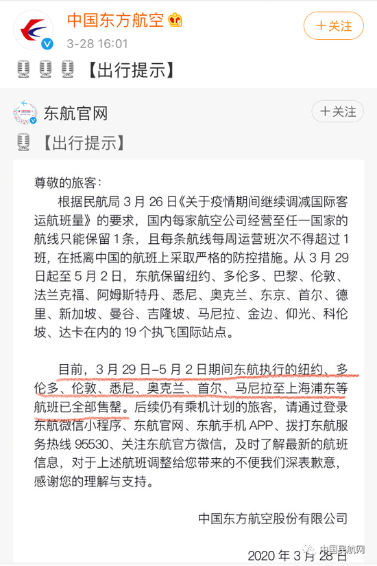 另一方面,随着海外疫情的持续蔓延,以留学生为主的海外华人回求需求猛增,回国机票一票难求,市场供需更加紧张。东航3月28日发布出行提示称“3月29日-5月2日期间东航执行的纽约、多伦多、伦敦、悉尼、奥克兰、首尔、马尼拉至上海浦东等航班已全部售罄。”