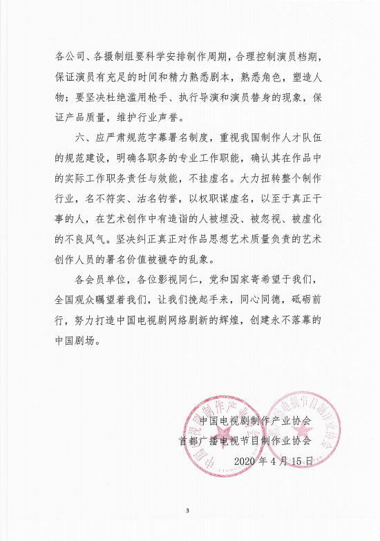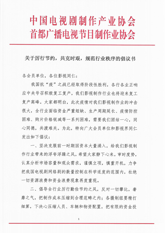 4月17日,中国电视剧制作产业协会官网显示,中国电视剧制作产业协会和首都广播电视节目制作业协会联合发布了《关于厉行节约,共克时艰,规范行业秩序的倡议书》(《倡议书》),倡导全行业厉行勤俭节约之风,反对一切攀比,奢靡之气。建议把制作成本压缩到合理范畴之内建议我国电视剧、网络剧制作成本应控制在毎集400万元人民币以内,摄制人员酬劳亦应同步降低30%。