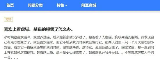 在上述意见的指引下,记者在网络上查找发现,确有网友表示看过虐猫、虐狗的场景后“感到很刺激”。在某浏览器的咨询网页上,就有一位匿名网友称喜欢猫咪但它不顺从的时候会想打它,后来在网上搜索观看各种虐猫视频,“越看越上瘾”;另一位网友是在一次偶然看到虐猫视频后,“现在都会去寻找类似视频观看”。