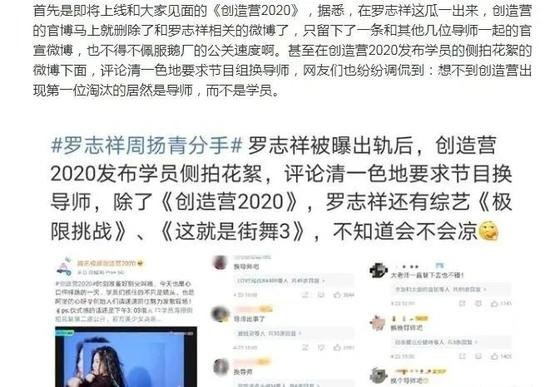 目前,罗志祥尚有《极限挑战》《创造营2020》等多个综艺在手。周扬青动动手指头,恐怕他的演艺事业很可能尽毁。