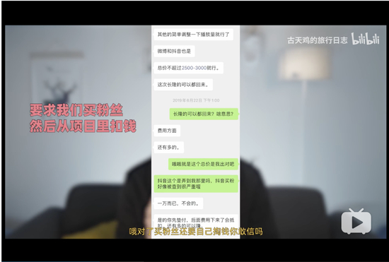 “林晨同学”发声几日后,一名叫做“古天鸡的旅行日记“的UP主也发布视频,声讨了同一家MCN机构“不差旅行”。他自称,作为旅行达人,签约前公司承诺会给予旅行经费补贴,但签约后,公司几乎没有给过任何资金支持,个人需要自费旅行拍摄素材,公司还要求达人自费购买粉丝。