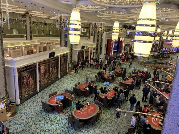 2月23日,下着小雨的周六,界面新闻记者和大量游客一起探访新葡京娱乐城(澳门称赌场为娱乐城),一路之隔便是老葡京,如今通常将两个赌场视为一体,这两座建筑分别落成于2007年、1970年,新葡京娱乐城一楼大厅就是赌场,设置了很多低投注额的博彩游戏,二楼、三楼以百家乐为主,四楼、五楼除了中场外,设置了部分贵宾厅。