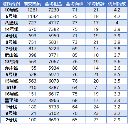 北京市各地铁线优居指数列表