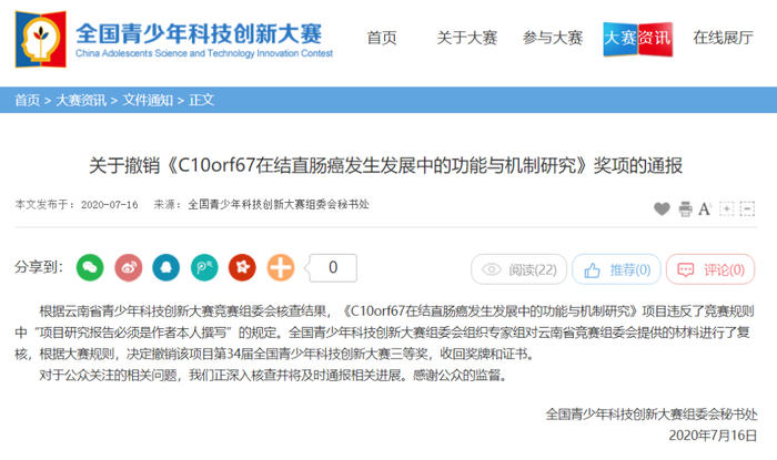 在云南省青创大赛组委会办公室发布通报之前,即7月15日下午,全国青少年科技创新大赛组织委员会秘书处也发出声明称,如发现违反大赛规则问题,将依规严肃处理,绝不姑息。他们将以此为契机进一步完善大赛评审规则与程序,强化监管机制,更好引导和规范青少年参与科技创新实践活动。欢迎社会公众继续监督,共同促进大赛持续健康发展。