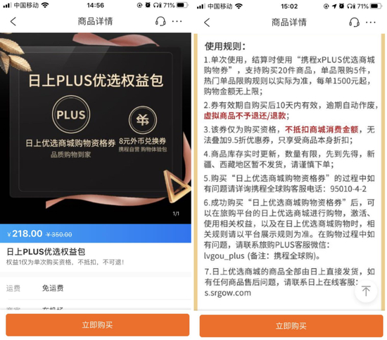 第二种,携程搜索“日上PLUS优选权益包”218元可获得购买资格,一张券代表一次的购买入场资格。一次可购买20件商品,单品限购5件,每单1500元起,购物金额无上限。
