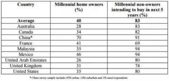 两年多之前,汇丰银行曾经在九个国家做过一项调查,调研对象是上万名千禧一代(出生于1980—2000年),结论是,中国的80后与90后的住房拥有率高达70%以上,遥遥领先于他们的国外同龄人。