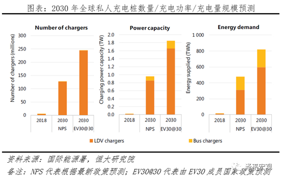 2019年5月国际能源署IEA发布《Global EV Outlook 2019》报告,并对2030年全球充电桩规模作出预测:基于各国最新政策(NPS)及EV30组织(EV30@30)国家政策两种情形,到2030年全球私人充电桩预计保有量分别达12800/24500万台,总充电功率达1000/1800GW,总充电量达480/820TWh;全球公共充电桩预计保有量达1000/2000万台,总充电功率达113/215GW,总充电量达70/124TWh。