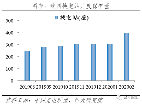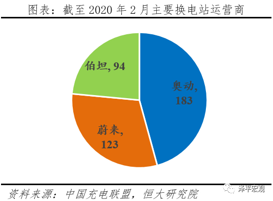 公共充电领域,慢充所需时间长,快充存在安全隐患且导致电池衰减严重等问题;相比公共充电而言,换电模式可迅速补充能源,解决里程和充电焦虑并降低购置成本。但是换电模式缺点也很明显,建站成本高、电池规格难统一,无法解决电池所有权问题;所以换电模式比较适合在公交车和运营车上使用,因为两者标准化程度高,而且对运营效率要求更严。在私家车领域,由于定制化属性强,换电模式只适用自家车型,更适合有一定销量规模的车企。据充电联盟统计,截至2020年2月,我国换电站保有量400座,相比2019年8月245座增加63.3%;主要运营商有三家,奥动、蔚来、伯坦分别运营183、123、94座。