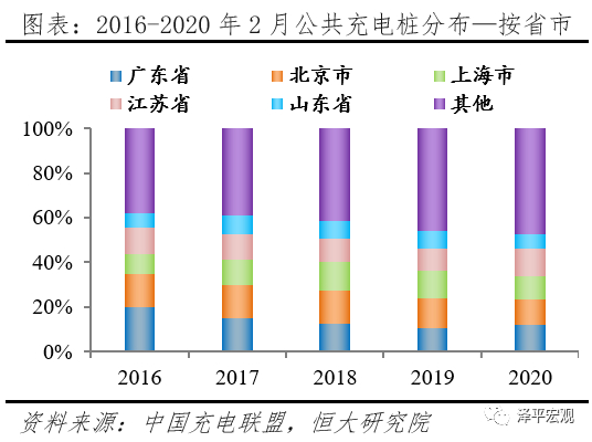 据中国充电联盟披露,截至2020年2月,我国公共充电桩TOP10省市分别为江苏、广东、北京、上海、山东、浙江、安徽、河北、湖北、福建,合计公共充电桩保有量39.24万台,占比73.9%,其中前四名市场份额皆超过10%,合计占比46.1%;从趋势上看,北京、上海、广东等发达地区公共充电桩市场份额持续降低,从2016年2月43.5%减少到2020年2月36.1%,二三线城市充电桩建设加快,从侧面映证我国新能源汽车往二三线城市渗透提速。