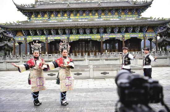 2月3日,贵州省榕江县融媒体中心和县艺术团的工作人员在拍摄快板说唱短视频,利用短视频宣传防疫知识。王炳真/摄