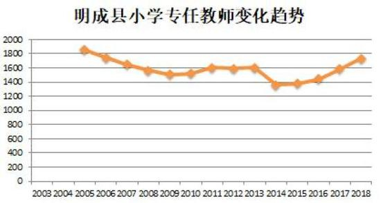 2019年3月,明成县发布的一份中小学教师招聘方案拟招聘297名教师,其中小学教师岗位210名,占到了70%,尤其语文和数学两个主科教师空缺最大,分别是66名和57名。今年的招聘方案也是类似情况。