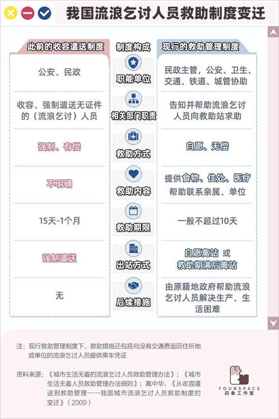 针对流浪乞讨人员,我国的救助制度也在不断完善,真正生活困难者其实有渠道寻求政府的帮助。以2003年为分界线,我国对流浪乞讨人员的管理模式从强制遣送逐渐转变为全方位的救助管理。从救助措施到流浪乞讨人员的认定方法,都在不断细化、完善。