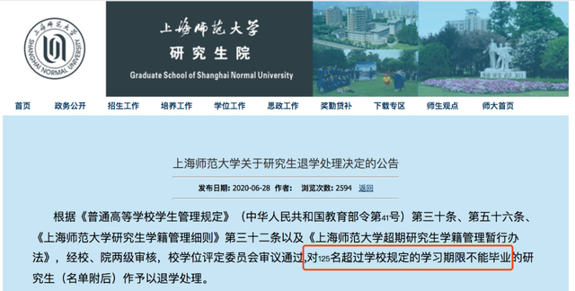 6月28日,上海师范大学发布公告,对125名超过学校规定学习期限不能毕业的研究生作出退学处理。
