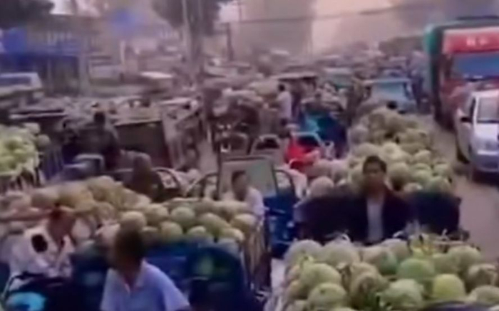 瓜农装着满车的西瓜却只能低价卖。视频截图