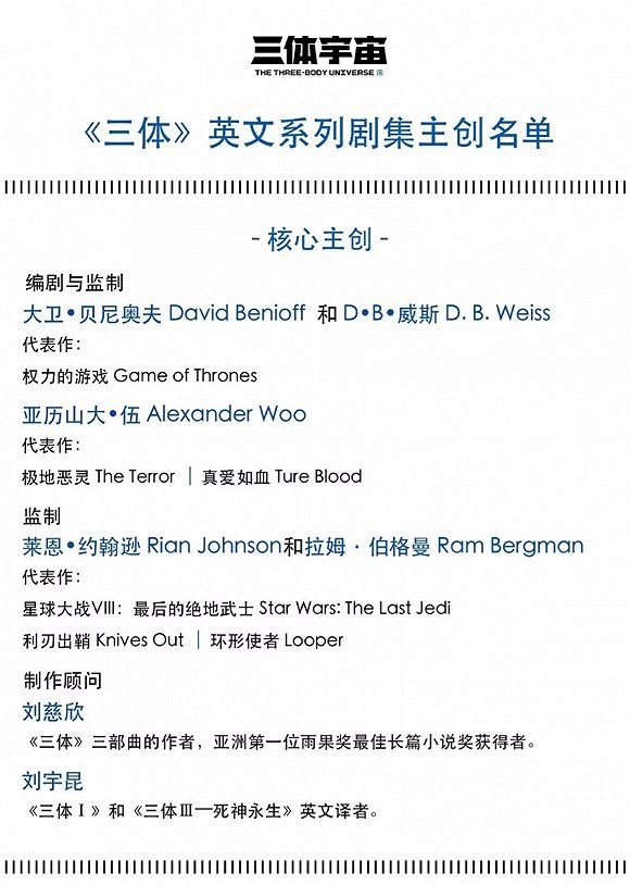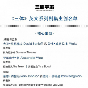 通过《三体》美剧官宣的主创团队配置来看,Netflix真的是有下血本准备大干一场,编剧监制是《权力的游戏》主创的大卫·贝尼奥夫和D·B·威斯,以及《极地恶灵》的亚历山大·伍。除此之外还包括执导过《星球大战·最后的绝地武士》《利刃出鞘》的莱恩·约翰逊和拉姆·伯格曼,而制作顾问则是由原作者刘慈欣以及英文译者刘宇昆担任。