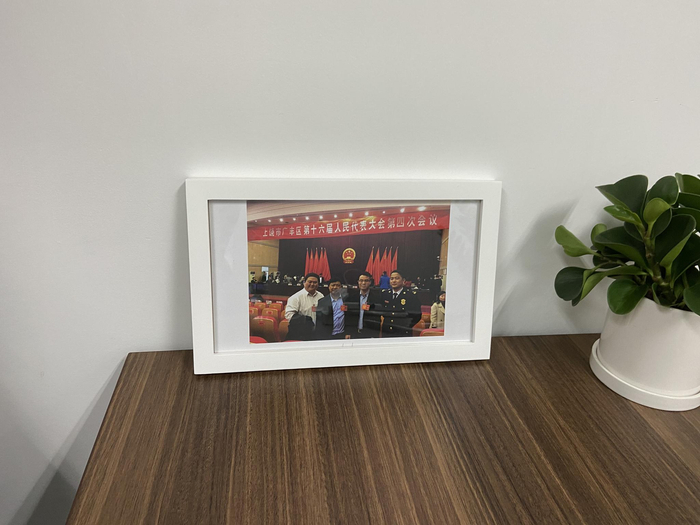 代孕公司“优孕行”广州分公司总经理蔡德亮自称为人大代表,其在办公室所展示的参加江西上饶市广丰区第十六届人大四次会议合照。