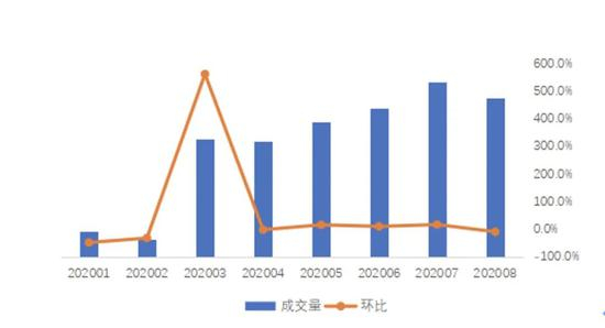 2020年 1月-2020年 8月杭州租赁住房成交量及环比变化。数据来源:贝壳研究院