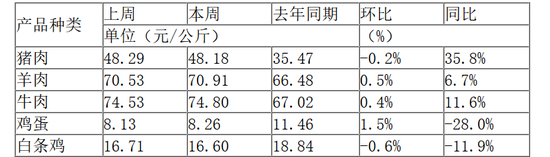 相比于白条鸡16.60元/公斤的价格,9月4日-10日全国农产品批发市场猪肉平均价格为48.18元/公斤,同比上涨35.8%,牛肉价格74.80元/公斤,同比上涨11.6%,羊肉价格70.91元/公斤,同比上涨6.7%。