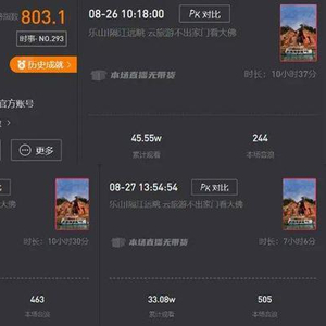 该直播是由成都市广播电视台官媒账号发布,8月累计直播30场,其中乐山大佛直播8场,单场累计观看远高于其他日常场次的直播数据。
